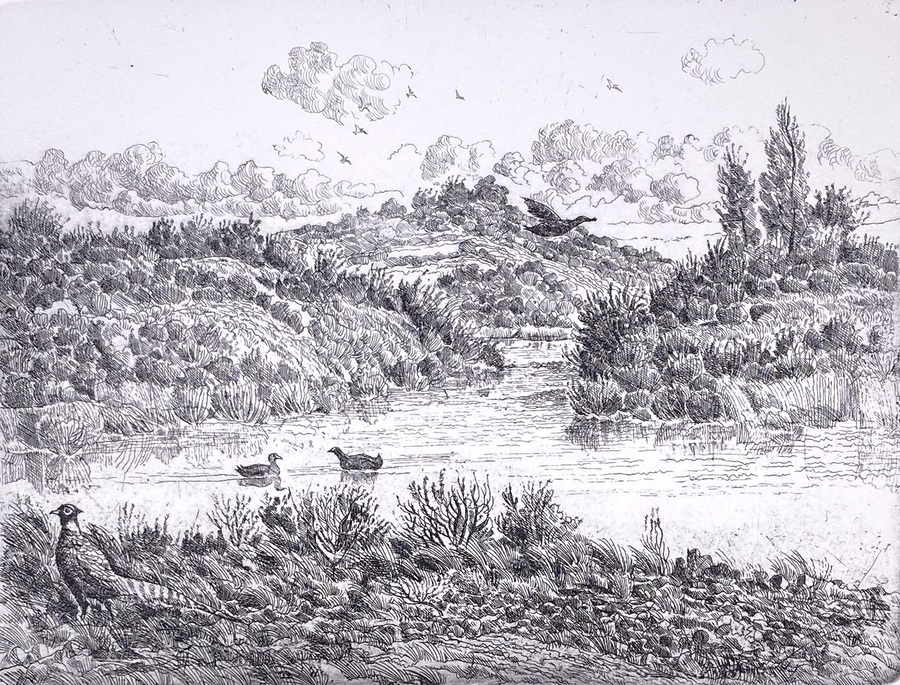 Ets van Gerard Johannes Maria Lutz (1914–1983) met de titel "Duinidylle". De ets, uitgevoerd in inkt op papier, stelt een realistisch landschap voor met een rivier, duinachtige omgeving en vogels, eenden en een fazant. Midden 20e eeuw, Nederland.