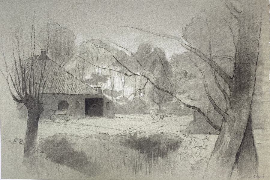 1431. Houtskooltekening, boerderij in landschap, Annie M. Dommering 1916, Nederland