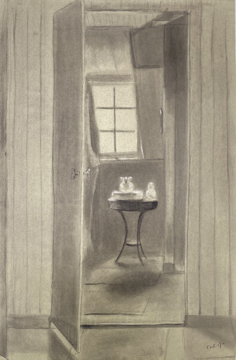 Tekening op Ingres-papier, gedateerd rechtsonder “Oct. 17”, uitgevoerd in houtskool en wit krijt. Annie M. Dommering (1896-1949). De voorstelling toont een geopend interieur met een tafel bij een raam. Het gebruik van licht en schaduw benadrukt de verstilde sfeer. Het papier draagt een watermerk “INGRES”, een veelgebruikt materiaal in academische tekenkunst.