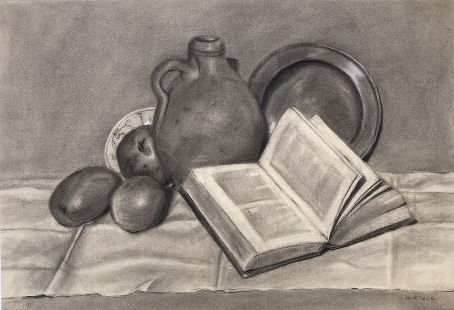 Houtskooltekening op Ingres-papier met watermerk "INGRES" en onleesbaar merk, Annie M. Dommering (1896-1949), gedateerd rechtsonder "20-28 Nov. 16". Voorstelling van een academisch stilleven met kruik, drie vruchten, tinnen schaal, bord en opengeslagen boek op tafelkleed. Afkomstig uit de vroege 20e eeuw, uitgevoerd als tekenstudie.