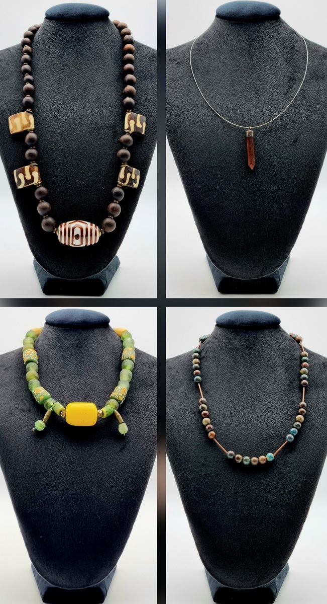 Vier eigentijdse halskettingen, eind 20e – begin 21e eeuw. Materialen: glas (waaronder millefiori/trade beads en een gele middenkraal), hout, Dzi-stijl kralen, staaldraad, textielkoord en metalen onderdelen met koper buisjes. Handgeregen en samengesteld; variërend van minimalistische hanger tot expressieve kralencolliers.