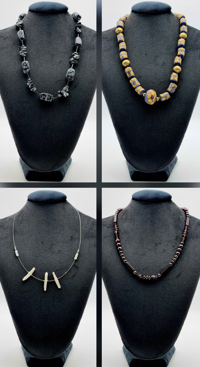 Vier halskettingen, 20e eeuw, vervaardigd uit glas, natuursteen, keramiek en organisch materiaal. Kenmerkend zijn de uiteenlopende stijlen: een ketting met sneeuwvlokobsidiaan en zwarte glaselementen, een ketting met grote blauw-gele kralen, een draadketting met drie hangers van organisch materiaal en een snoer met donkerrode kralen en cilindervormige elementen.