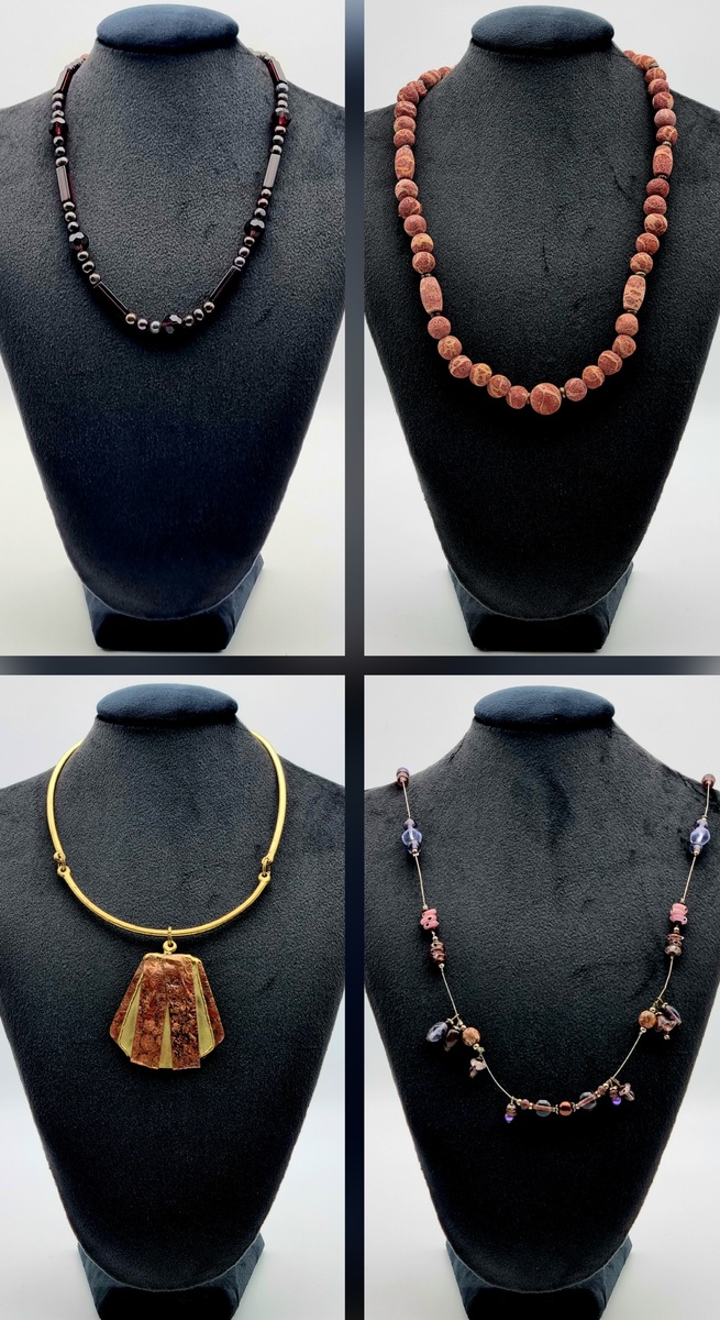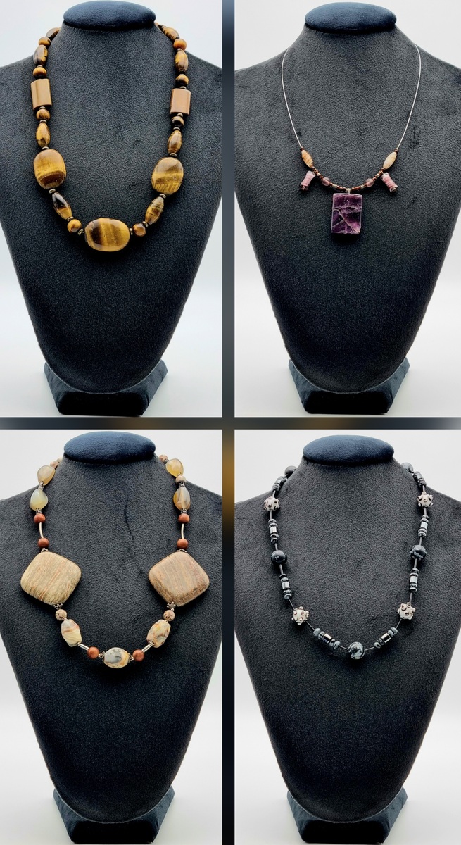 Vier moderne halskettingen, daterend uit de tweede helft van de 20e eeuw. De sieraden zijn vervaardigd van een combinatie van natuursteen en metaal, en afgewerkt met de techniek van het rijgen en monteren. Een van de halskettingen heeft een waaiervormige hanger aan een halsring van messing. De stenen zijn gevarieerd in vorm en kleur.