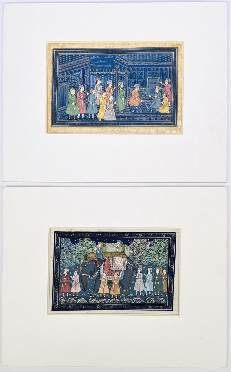 Beschilderd zijde in Indo-Perzische miniatuurstijl, tweede helft 20e eeuw, India. Dekkende verf en inkt op zijde met de hand aangebracht; gemonteerd in passe-partouts met goudkleurige binnenrand. Te zien zijn een hofscène in interieur en een processie met olifant in een nachtelijk landschap. Kleuren overwegend blauw, groen en oker. Montage op grijs karton zichtbaar op de achterzijden.