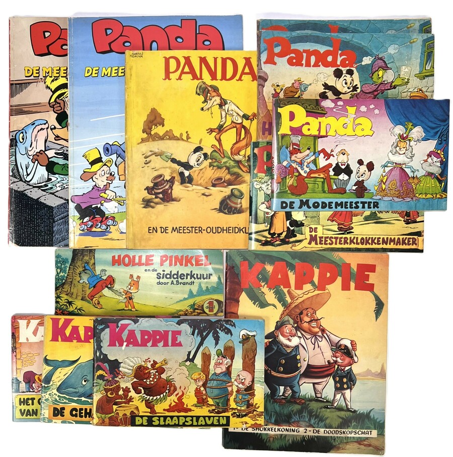 Nederlandse stripboeken van Marten Toonder (1912–2005) en medewerkers van de Toonder Studio’s, gedrukt in kleurendruk op papier, omstreeks jaren 1950–1970. Het betreft uitgaven uit de reeksen Kappie, Panda en Holle Pinkel, met titels als De smokkelkoning, De meester-oudheidkundige, De slaap-slaven en De gehaaide potvis. Kenmerkend zijn humoristische, avontuurlijke omslagen in klassieke Toonder-stijl.