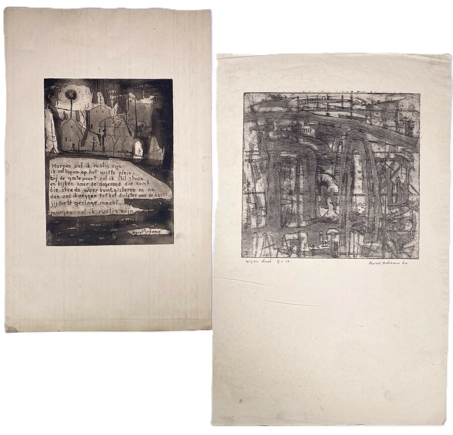 Twee etsen van Karel Arkema (1901–1965), lid van De Ploeg, beide uit 1960. Uitgevoerd op papier in modernistische stijl met expressionistische invloeden. Eén ets toont een stadslandschap met poëtische tekst en is in de plaat gesigneerd, de andere ets is rechtsonder met potlood gesigneerd “Karel Arkema 60” en linksonder voorzien van "eigen druk 9-10”.