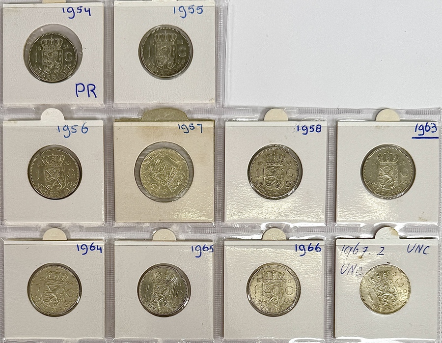 Tien Nederlandse 1-guldenmunten met portret van Juliana, geslagen in zilver(720/1000), jaren 1954–1967. Voorzijde met randschrift “JULIANA KONINGIN DER NEDERLANDEN”; keerzijde met gekroond wapen en waarde “1 G”, jaartal bovenaan. Geleverd in afzonderlijke kartonhouders met notities, waaronder “UNC” bij 1967.