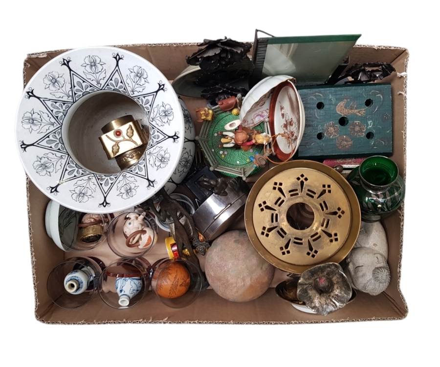 Lot van diverse curiosa uit de 20e eeuw, van uiteenlopende materialen waaronder keramiek, glas, messing, hout en textiel. Omvat onder meer een grote porseleinen schaal, diverse glazen, brons en een pillendoosje.