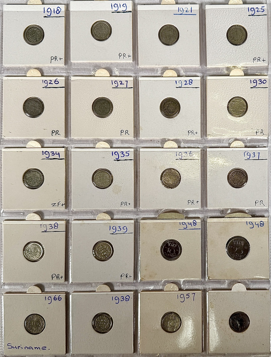 Lot van 20 Koninkrijk der Nederlanden munten: 19 dubbeltjes (10 cent) en 1 kwartje (25 cent), geslagen door ’s Rijks Munt te Utrecht, datering 1918–1966. Voor 1940 in zilver 0,640, naoorlogse exemplaren in nikkel/cupro-nikkel. Met portretten van Koningin Wilhelmina en Koningin Juliana en klassieke kroon- en lauwerkransmotieven. Inclusief één 10 cent Suriname 1966.