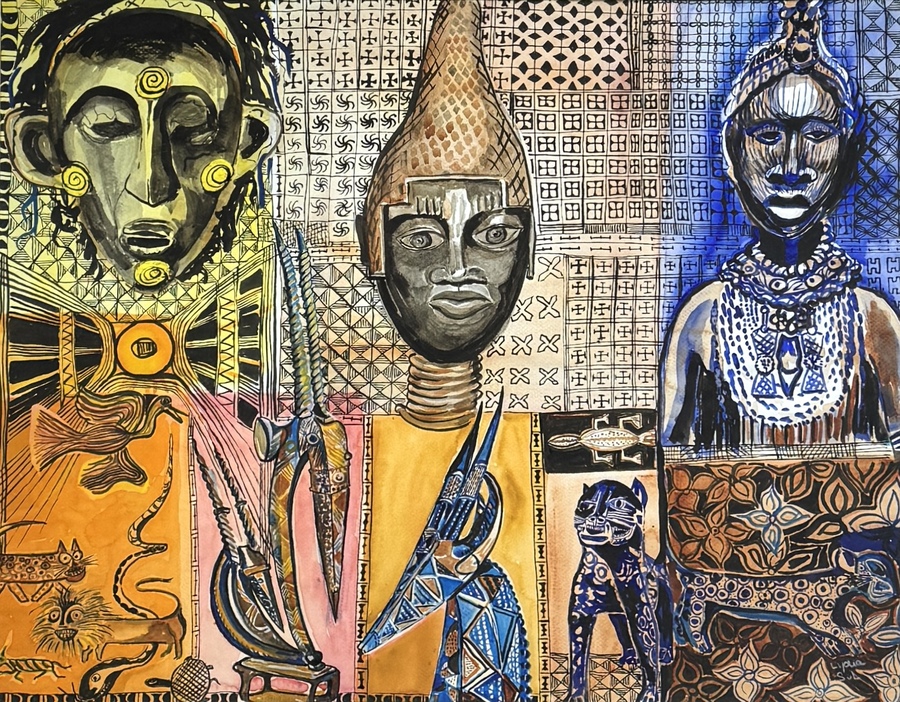 Tekening op papier in Afrikaanse stijl, rechtsonder gesigneerd “Lydia Sul”. Uitgevoerd in gemengde techniek (inkt en gouache) met oker-, blauw- en zwarte accenten. De voorstelling toont drie gestileerde hoofden, rituele voorwerpen, dieren en door textiel geïnspireerde patronen in vlakverdeling. Datering: tweede helft 20e eeuw.