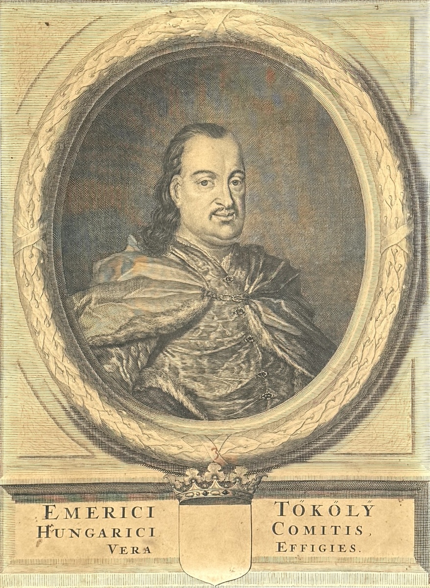 Gravure van Imre Thököly (1657–1705), uitgevoerd in barokke stijl, laat 17e eeuw tot begin 18e eeuw. Voorstelling van de Hongaarse edelman en legerleider in hofkledij, gevat in een ovale lauwerkrans en geplaatst boven een cartouche met kroon en leeg wapenschild. Uitgevoerd in kopergravure op papier, gemonteerd in een houten lijst met gesneden blad- en parelranddecoratie.