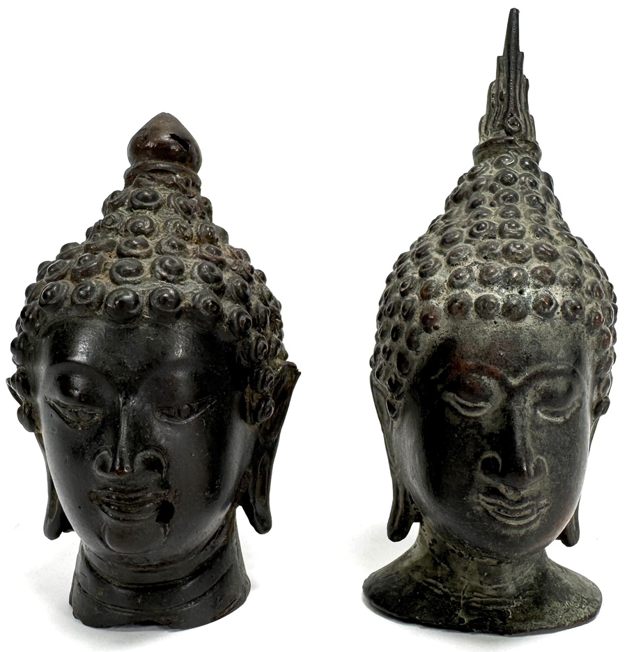 Paar bronzen boeddha beeldjes, midden 20e eeuw, Zuidoost-Azië. Gegoten in verloren was gieting (cire perdue) en nadien geciseleerd met donkere patina. Kenmerkend zijn de slakken-krullen, lange oorlellen, ovale gezichtsvorm en ushnisha: één hoofd met knobbel, één met vlamvormige top.
