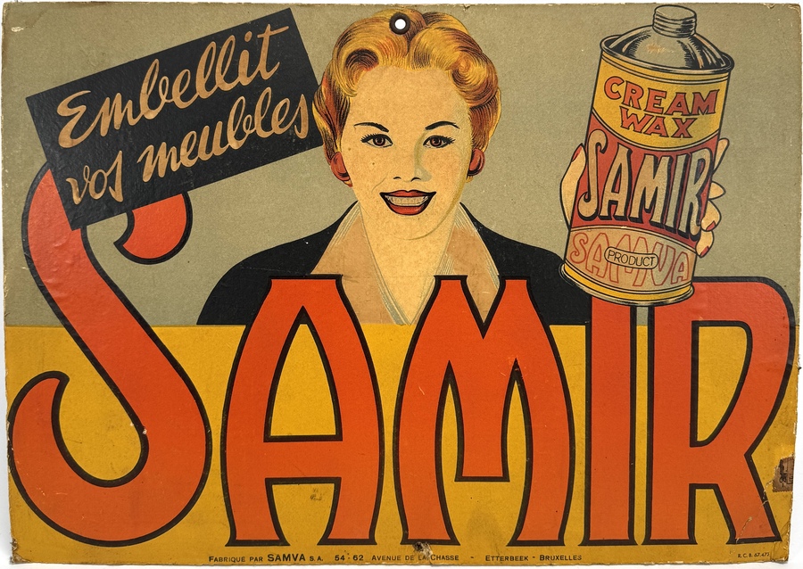 Vintage reclamebord van karton, uitgevoerd door SAMVA S.A., Brussel, midden 20e eeuw. Kleurenlitho met voorstelling van een blonde vrouw die een bus Samir Cream Wax toont, voorzien van de tekst “Embellit vos meubles”. Met grote rood-zwarte typografie “SAMIR” op een gele achtergrond. Het bord is uitgerust met zowel ophangoog als steunpoot.