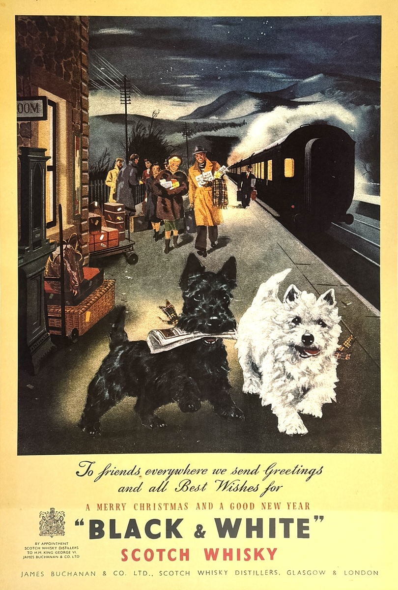 Vintage reclameposter "Black & White" Scotch Whisky, uitgegeven door James Buchanan & Co. Ltd., omstreeks jaren 1940–1950. Uitgevoerd in kleurenlithografie op papier, in commerciële illustratieve stijl. De voorstelling bevat een stationsscène met reizigers en een stoomtrein, op de voorgrond de kenmerkende zwarte en witte terriërs als merkiconen, vergezeld door kerst- en nieuwjaarsgroet.