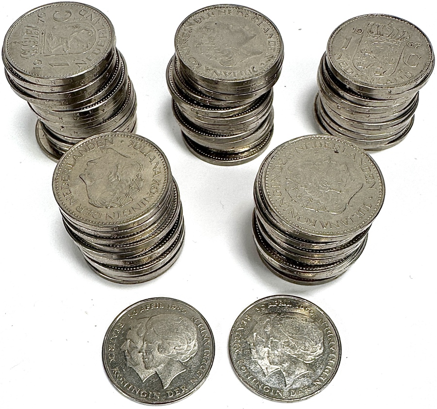 Verzameling Nederlandse guldens uit de jaren 1960 tot en met 1990, geslagen door de Koninklijke Nederlandse Munt. Ontwerpen van Ludwig Oswald Wenckebach (1895–1962) en Bruno Ninaber van Eyben (1950). Uitgevoerd in zilver en nikkel met reliëfslag. Aanwezig zijn munten van Juliana en Beatrix, voorzien van het rijkswapen.