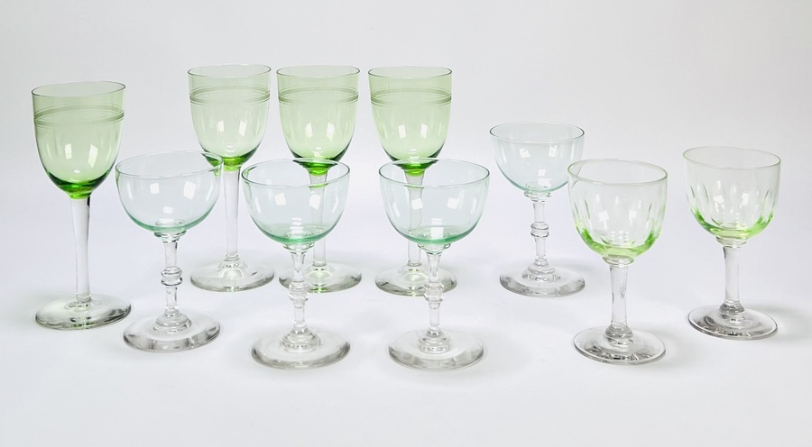 Art Deco uraniumglas glazen, eerste helft 20e eeuw (omstreeks 1920–1940). Mondgeblazen glas met uraniumoxide, gemengde techniek met optisch geblazen decor en plaatselijk geslepen en gepolijste randen. Bestaat uit wijnglazen met lichtgroene kelk en heldere stelen; bij enkele glazen dubbele bies aan de rand, knopstelen en optische ovalen.