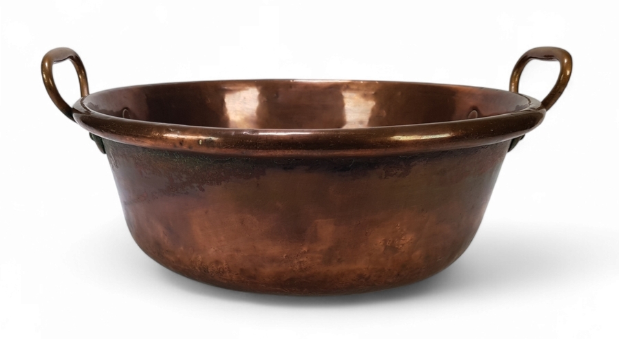 Koperen jamketel (bassine à confiture), Frankrijk, midden 20e eeuw. Functioneel keukenobject met brede omgerolde rand en twee geklonken messing handgrepen. Handgeslagen en gedreven koper; interieur ongevoerd, geschikt voor het koken van suiker en fruit.