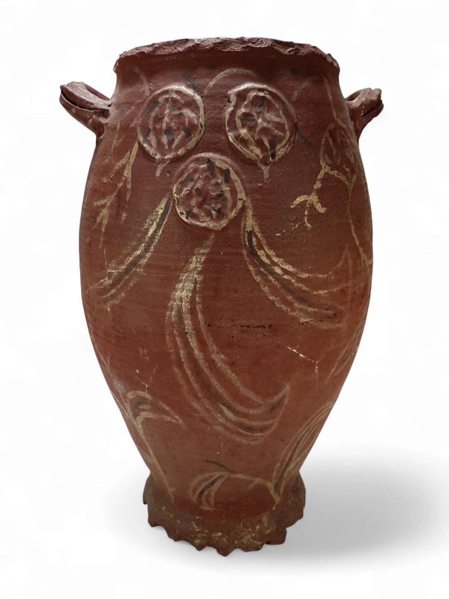 Een handgevormde keramieken kruik uit de eerste helft van de 20e eeuw, in een traditionele en archeologische stijl. De kruik is beschilderd met gestileerde cirkels, lijnen en spiralen in wit en messingkleurige verf op een donkerrode ondergrond. De techniek van het vervaardigen omvat handvormen en beschilderen.