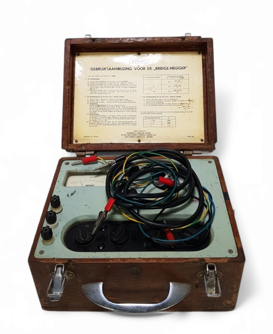 Houten draagbare kist met geïntegreerd meetinstrument "Bridge-Megger", midden 20e eeuw, gebruikt door de PTT (Posterijen, Telegrafie en Telefonie). Uitgevoerd in hout, met metalen sluitingen, handvat, zwengel en kunststof knoppen. Binnenzijde deksel met Nederlandstalige gebruiksaanwijzing. Voorzien van PTT-merkje aan de voorzijde en inclusief originele kabels met klemmen.