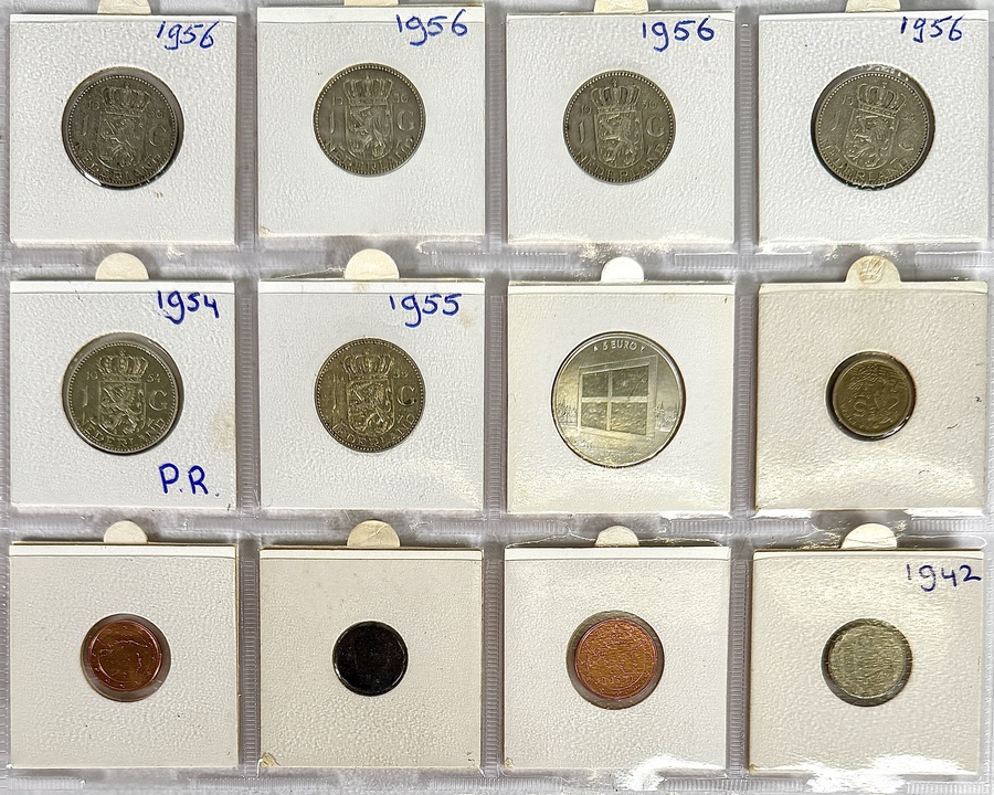 Twaalf Nederlandse munten in kartonnen houders met onder meer guldens. De munten, vervaardigd van zilver, koper en messing, merendeel gedateerd uit de periode van 1942 tot 1966. De munten tonen portretten van Koningin Juliana en Koningin Beatrix en zijn ontworpen door onder anderen Ludwig Wenckebach.