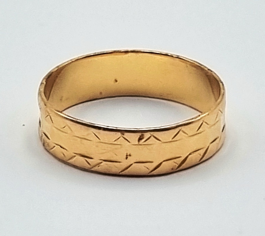 Gouden ring uit omstreeks midden 20e eeuw, uitgevoerd in 18 karaat goud, gemerkt aan de binnenzijde met 18 en meesterteken iK. De band toont een machinaal gegraveerd geometrisch patroon met kruis- en lijnstructuren. De ring is glad gepolijst aan de binnenzijde en getoetst op goudgehalte. Functioneel klassiek ontwerp met decoratief accent, mogelijk vervaardigd als trouw- of herdenkingssieraad.
