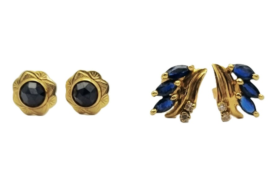 Twee paren gouden oorbellen van 14 karaat, gemerkt met het eikenblad en daterend eind 20e eeuw. Het ene paar is bezet met granaat en heeft een florale zetting. Het andere paar is bezet met blauwe stenen en diamantjes. Uitgevoerd in geelgoud met fijne gravure- en zetwerk.
