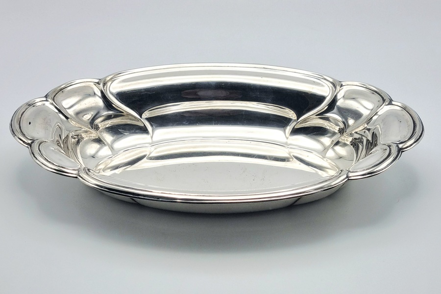 Art Nouveau zilveren broodschaal omstreeks begin 20e eeuw, vervaardigd uit 830/1000 zilver. De schaal is ovaal en vertoont bloembladachtige segmenten aan de rand. Onderzijde gemerkt met halve maan, kroontje, 830 en meesterteken.