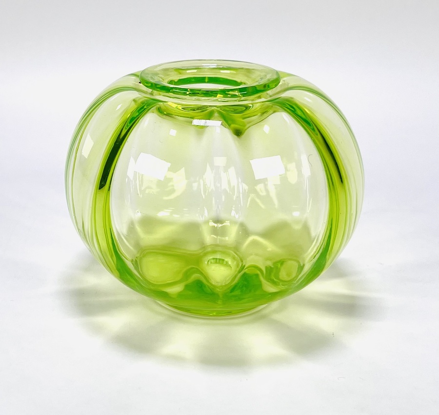 Uranium groen glazen vaas, ontwerp W.J. Rozendaal en uitvoering Kristalunie Maastricht. Modelnaam "Tomaat no. 5" en ontworpen in 1929. Literatuur: afgebeeld in Kristalunie Maastricht, A.v.d.Kley-Blekxtoon: pag.51. Niet gemerkt.