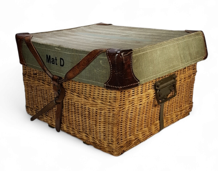 Proviandmand van het Zwitserse leger uit omstreeks jaren '40, vervaardigd uit gevlochten rotan met canvasdeksel, lederen versterkingen en metalen sluitingen. De militaire aanduiding “Mat D” is prominent zichtbaar. Binnenzijde met documenten vak en lederen riem. De mand rust op houten blokken en heeft metalen zijgrepen. Robuust uitgevoerd voor transport en veldgebruik. Herkomst: Zwitserse militaire uitrusting.