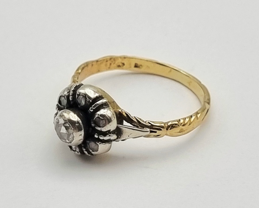 Een gouden ring in Victoriaanse stijl, daterend circa 1880-1900. De ring is gezet met een centrale roosgeslepen diamant en zes kleinere diamanten, ca. 0,14 ct. De zetting is van zilver, terwijl de ringband van 14 karaat goud is, gemerkt met het eikenblad en 585. De ring is aan de zijkanten gedecoreerd met een gravure.