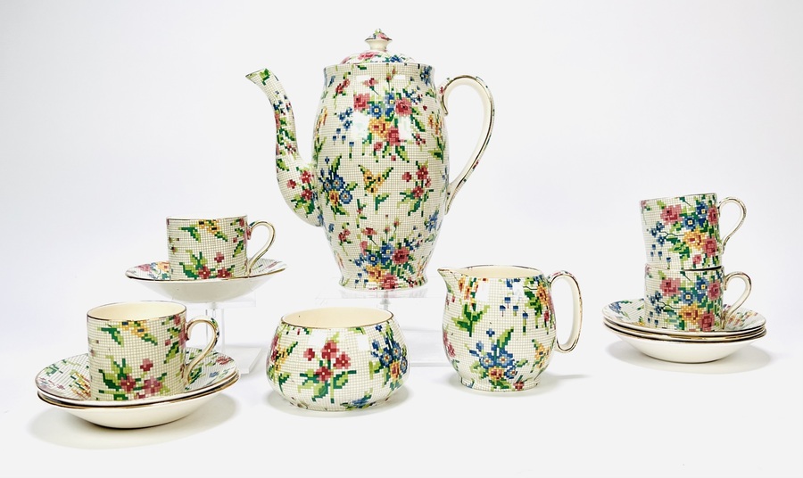 Keramisch servies van Royal Winton Grimwades (opgericht 1885), uitgevoerd in chintz-stijl met pixelachtig bloemendecor. Model “Queen Anne”, gemerkt onderzijde met registratienummer 15541. Het servies bestaat uit een koffiepot, roomkan, suikerpot en vier kop-en-schotels, midden 20e eeuw.