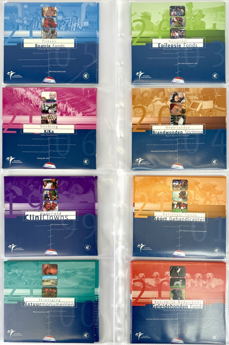 Map met acht Nederlandse Goede Doelen eurosets uitgegeven door de Koninklijke Nederlandse Munt, begin 21e eeuw. Iedere set bevat BU-munten van 1 cent t/m 2 euro, voor- en achterzijde tonen logo’s en toelichting van o.a. Prinses Beatrix Fonds, Epilepsie Fonds, Brandwonden Stichting, KiKa, CliniClowns, Natuurmonumenten, KNGF en Sport Gehandicapten.