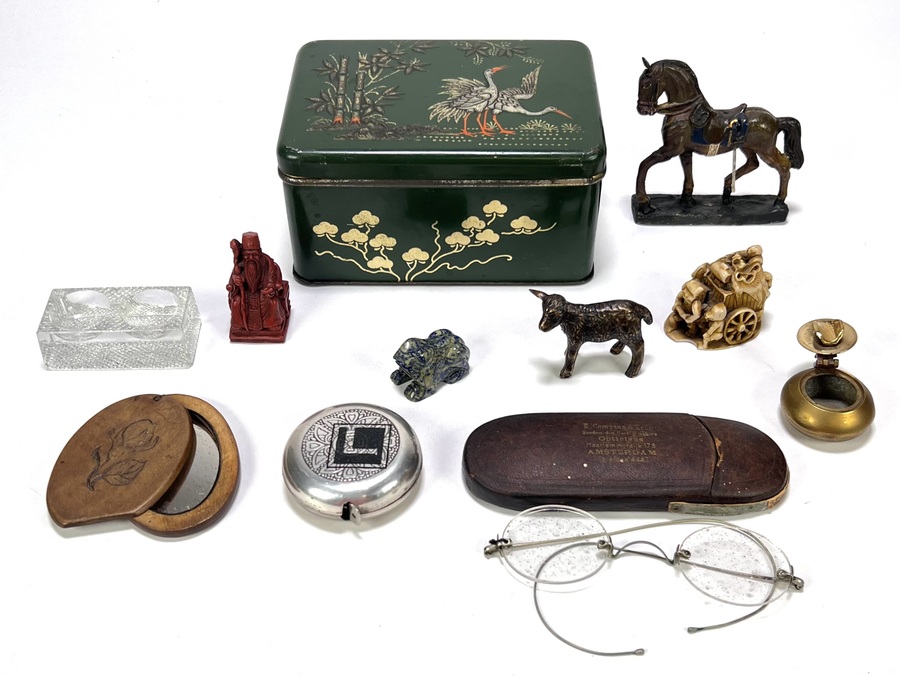 Een verzameling van diverse objecten uit de 20e eeuw in een gelakt blik met kraanvogels en bamboe. Met onder meer gesneden stenen beeldjes, een glazen asbak, een koperen geit, een bril met leren hoes en een metalen stempel. De gebruikte materialen variëren van gelakt blik en hout tot glas en messing.