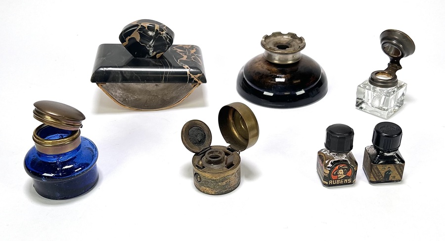 Verzameling schrijfbenodigdheden, omstreeks 1900–1950: zwarte marmeren wiegblotter, kobaltblauwe glazen inktpot met messing schroefdeksel, grote bruinpaarse bureau-inktpot met brede messing hals, kleine achthoekige inktpot met scharnierend deksel, twee kleine inktflesjes met origineel “Rubens”-etiket en een cilindrisch messing reisinktpotje.