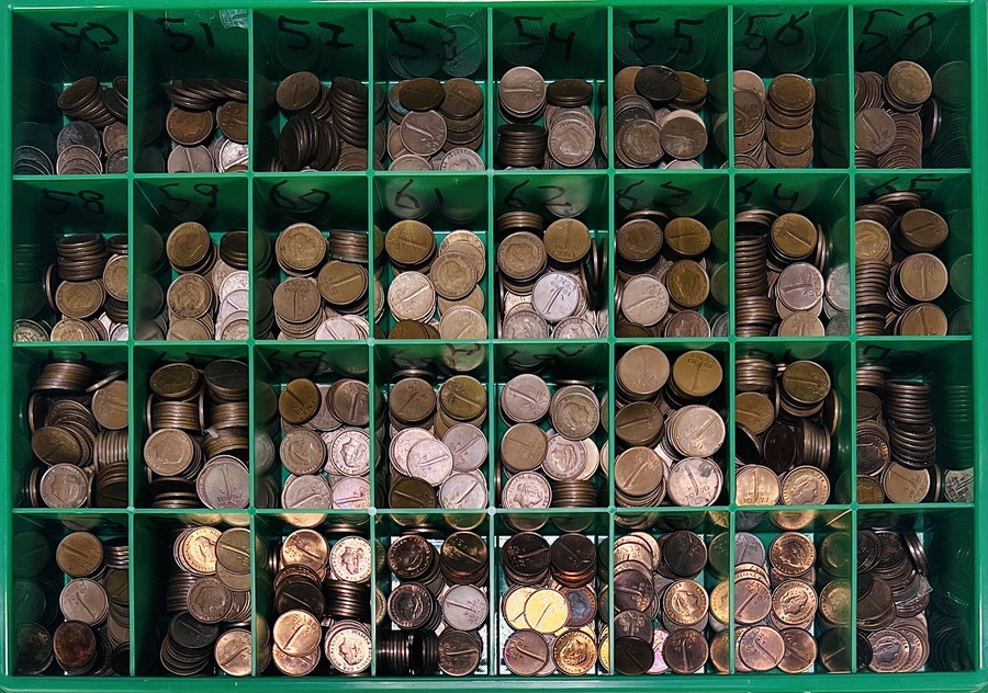 Verzameling centen in een groene plastic opbergdoos. De collectie is geordend in genummerde vakjes en toont een verscheidenheid aan jaartallen.