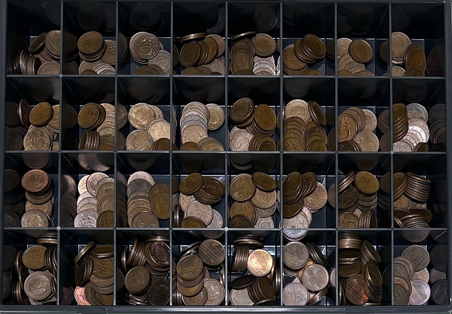 Collectie Nederlandse stuivers (5 cent) in sorteerbak met vakverdeling, 2e helft 20e eeuw. Overwegend bronzen uitgiften; machinaal geslagen circulatiegeld met verschillende ontwerpen, waaronder portret- en grafische typen uit de Juliana- en Beatrix-periode. Diverse jaartallen, gemengd gesorteerd per vak.