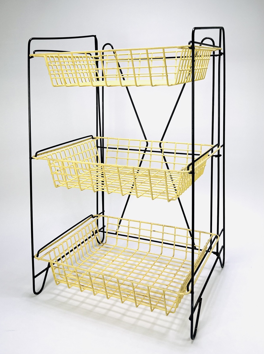 Vintage keukenrek vervaardigd in een minimalistische en functionele stijl uit circa midden 20e eeuw. Het keukenrek is gemaakt van geplastificeerd metaal in zwart en geel door Tomado. Het rek bestaat uit drie gele, uitschuifbare manden in een zwart frame met asymmetrische X-vormige verbindingen aan de zijkanten.