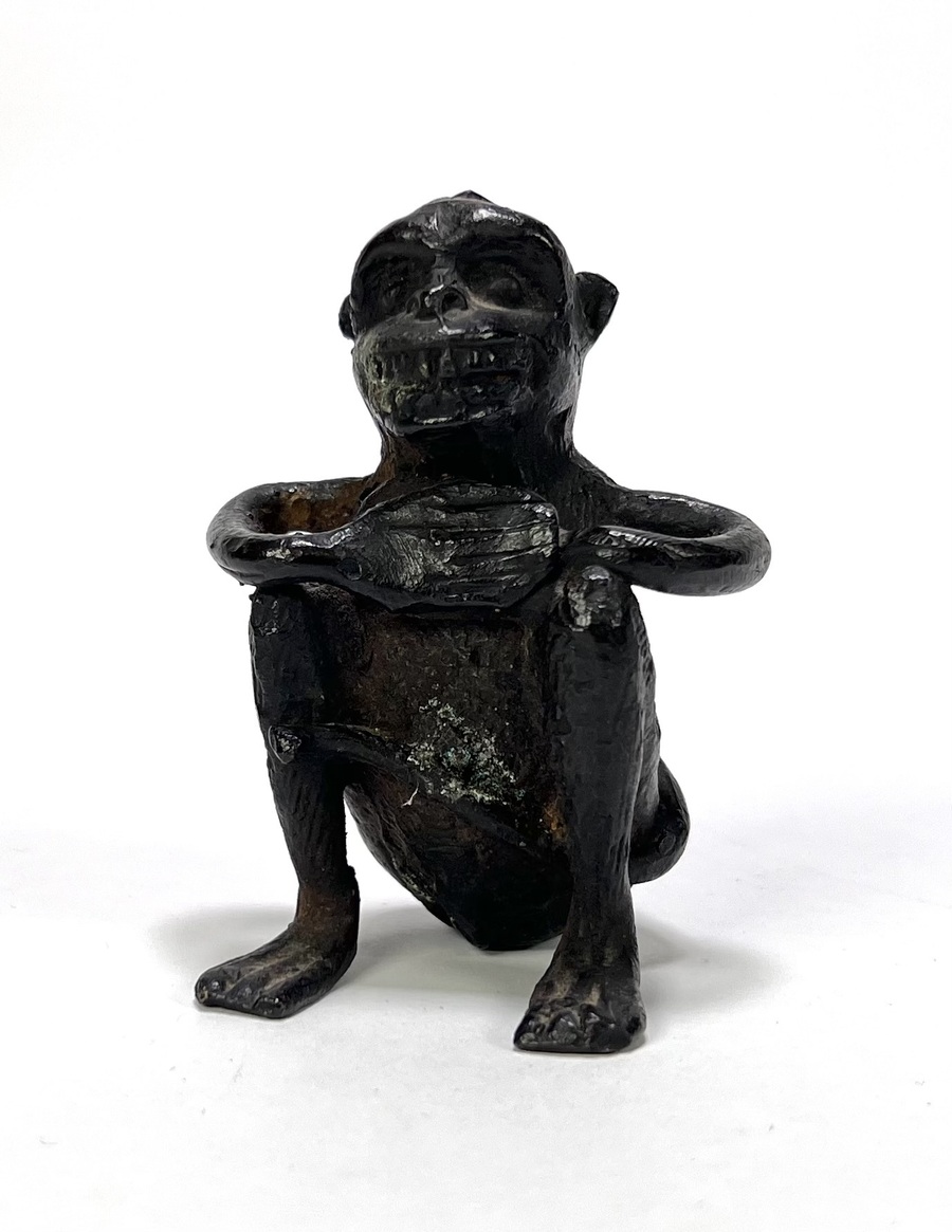 Bronzen beeldje in traditionele Afrikaanse stijl, circa 20e eeuw, voorstellend een zittende aap met de armen om de knieën. Uitgevoerd in vaste giettechniek met patina en sporen van oxidatie. Kenmerkend zijn de geprononceerde gelaatsuitdrukking, gedetailleerde vachtstructuur, naar voren geplaatste voeten en gebogen staart. Beeldje met antropomorfe uitstraling en etnografische karakteristiek.
