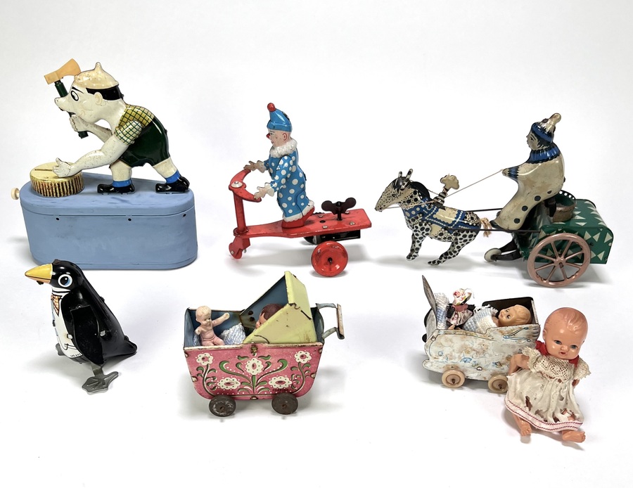 Verzameling blikken speelgoed in lithografische stijl, omstreeks 1930–1960. Diverse fabrikanten; onderdelen gemerkt ‘MS 295’ en ‘FOREIGN’. Uitgevoerd in geperst en gelithografeerd blik, met veermechaniek en sleutelaandrijving; popjes van kunststof/celluloid. Verzameling bestaat uit een pinguïn, clown op step, houthakker-automaat, ezel met wagen en twee kinderwagens. Markeringen en motieven duidelijk zichtbaar; gevarieerde mix van thema’s.