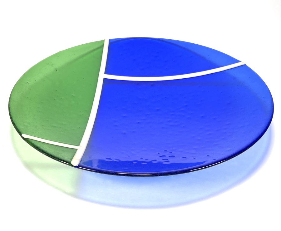 Kleurrijke modernistische glazen schaal in abstract-geometrische stijl, eind 20e – begin 21e eeuw. Rond model met kobaltblauwe en groene segmenten, gescheiden door opake witte banen, kleine luchtbelinsluitingen zichtbaar. De onderzijde is vlak en randen licht afgerond met matte finish.