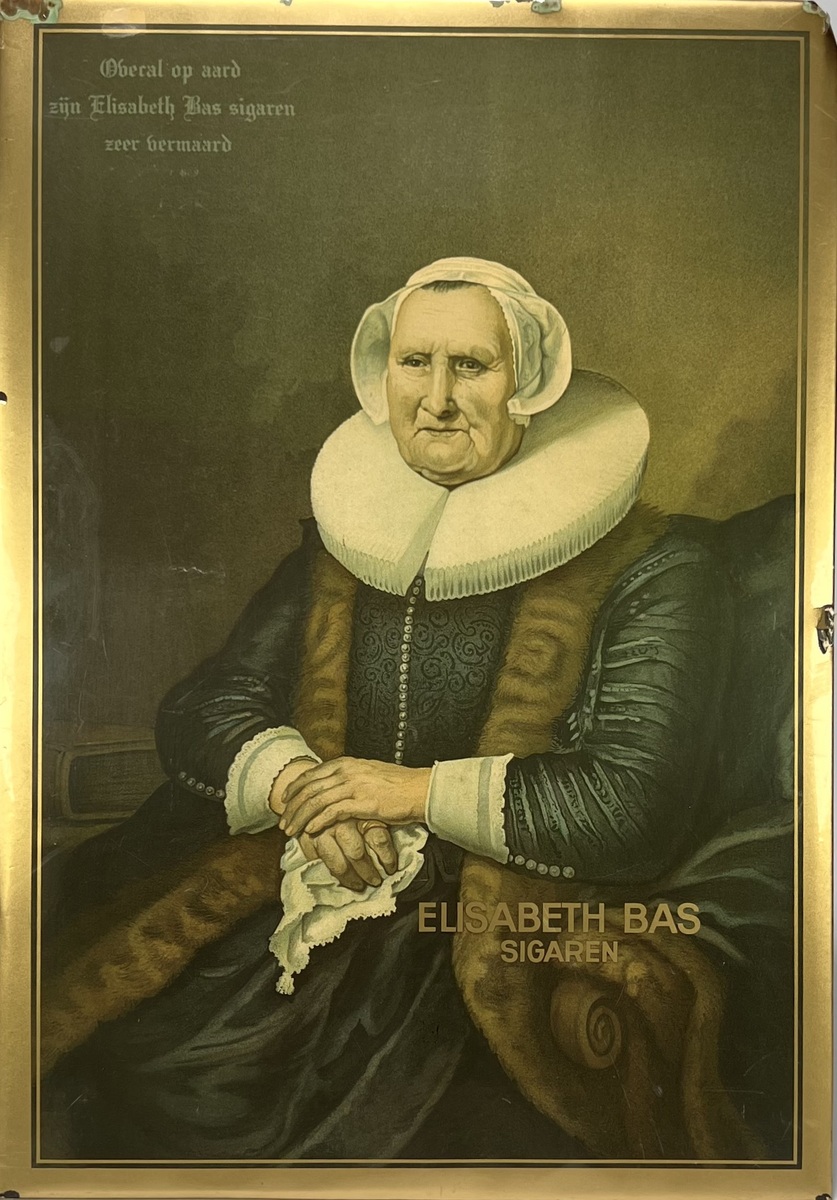 Blikken reclamebord, een reproductie van het schilderij 'Portret van Elisabeth Bas' van Ferdinand Bol. Het reclamebord dateert van circa midden 20e eeuw, inscriptie "Overal op aard zijn Elisabeth Bas sigaren zeer vermaard" en de merknaam "ELISABETH BAS SIGAREN" zijn duidelijk zichtbaar. Achterzijde met ophangkoord en uitklapbare standaard.