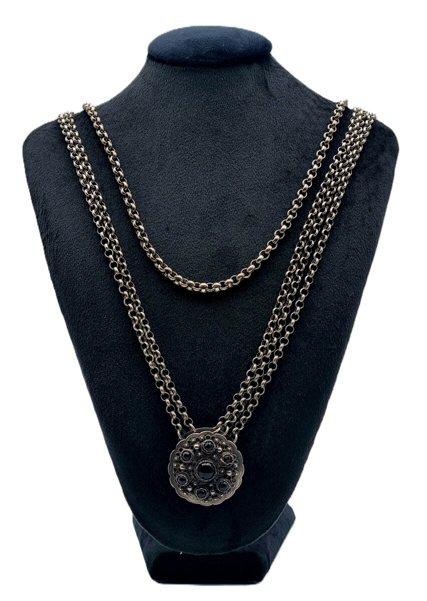 Twee zilveren kettingen, een drievoudige jasseron met ronde rozethanger die tevens als broche te dragen is, uitgevoerd met filigrain en granulatiedecor, gezet met zwarte gefacetteerde steentjes, op de achterzijde gemerkt met het Nederlandse zwaardje, datering eerste helft twintigste eeuw. Daarbij een lange ketting gemerkt 925, laat twintigste eeuw.
