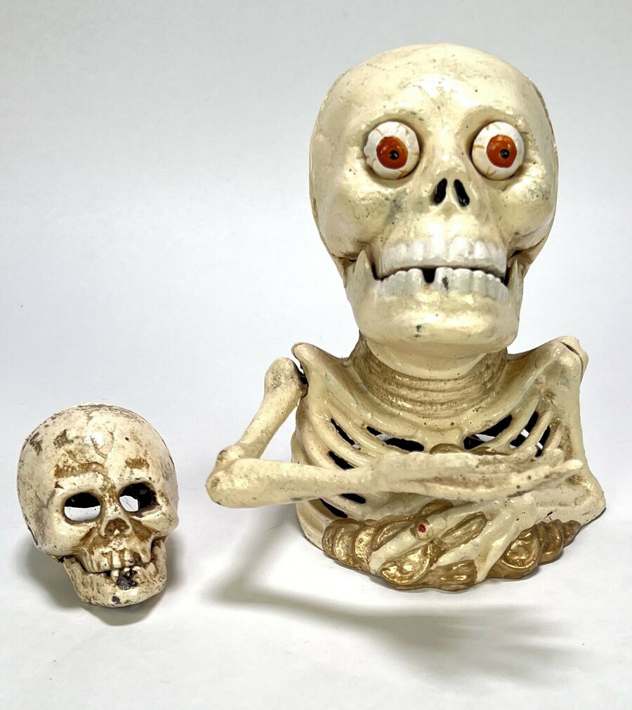 1160. Gietijzeren skeletspaarpot en schedel, 2e helft 20e eeuw