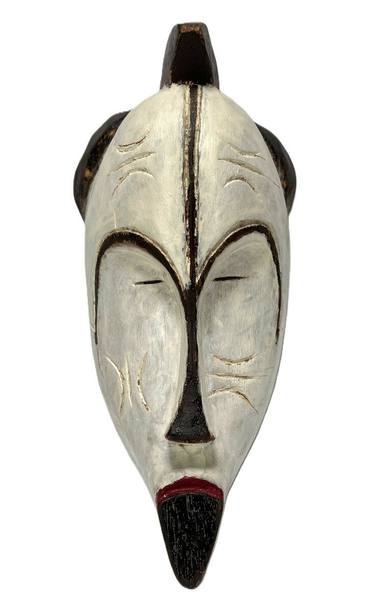 Houten masker in traditionele Afrikaanse stijl, ca. midden tot laat 20e eeuw, met langgerekte gelaatstrekken, wit gepigmenteerd oppervlak, zwart geverfde haarpartij, rode mondaccenten en decoratieve insnijdingen. Afkomst vermoedelijk beïnvloed door Fang- of Kota-volkeren uit Gabon, gebruikt voor ceremoniële of decoratieve doeleinden.