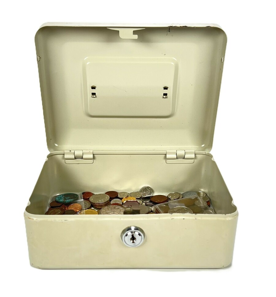 1154. Verzameling muntgeld in kistje, diverse landen, 20e eeuw