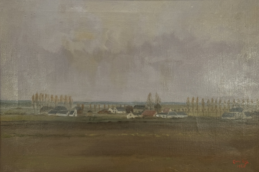 Schilderij door Hans Zijl, 1928, uitgevoerd in olieverf op doek. Realistische, tonale landschapsweergave met lage horizon, dorpje, populierenrijen en bewolkte lucht. Rechtsonder gesigneerd en gedateerd in rood: “Hans Zijl, 1928”. Opgespannen op spieraam, in eenvoudige houten lijst.