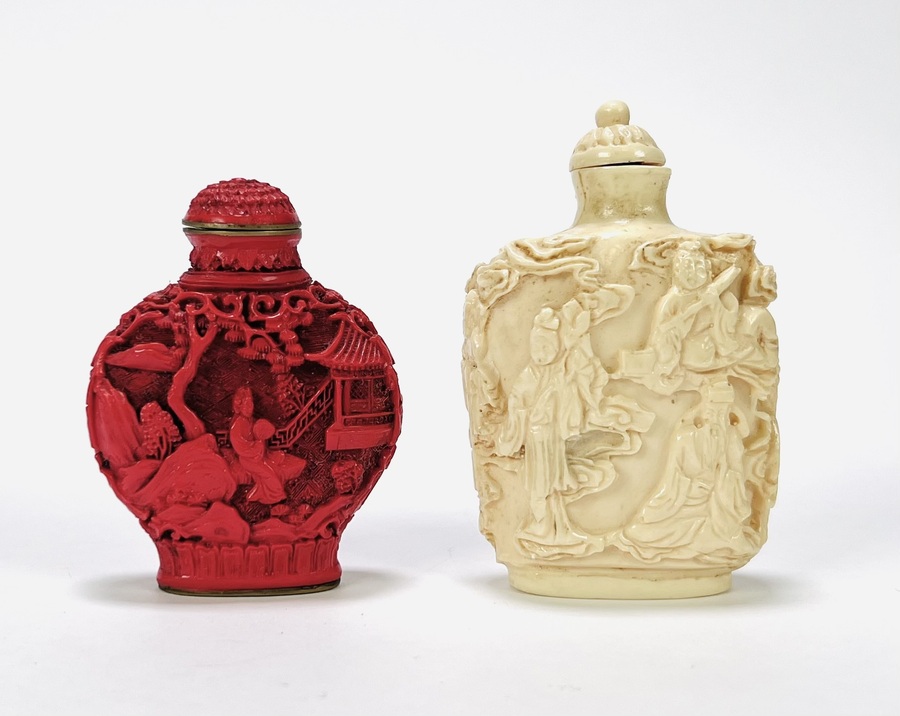 Twee Chinese snuifflesjes, ca. 1950–1980. Gegoten en deels nabewerkt kunsthars, één rood cinnabar stijl met messing monturen en lepeltje aan kurk, één ivoorkleurig met hoogreliëf figuren. Onderzijde rood exemplaar met ovaal cartouche met Chinese karakters; het ivoorkleurige stuk met ingekraste tekens Chenghua. Klein formaat, bolle schouders, afgeronde voet en lossende doppen, decor cinnabar flesje paviljoen en tuinfiguren; ivoorkleurig flesje met wolken, wijzen.