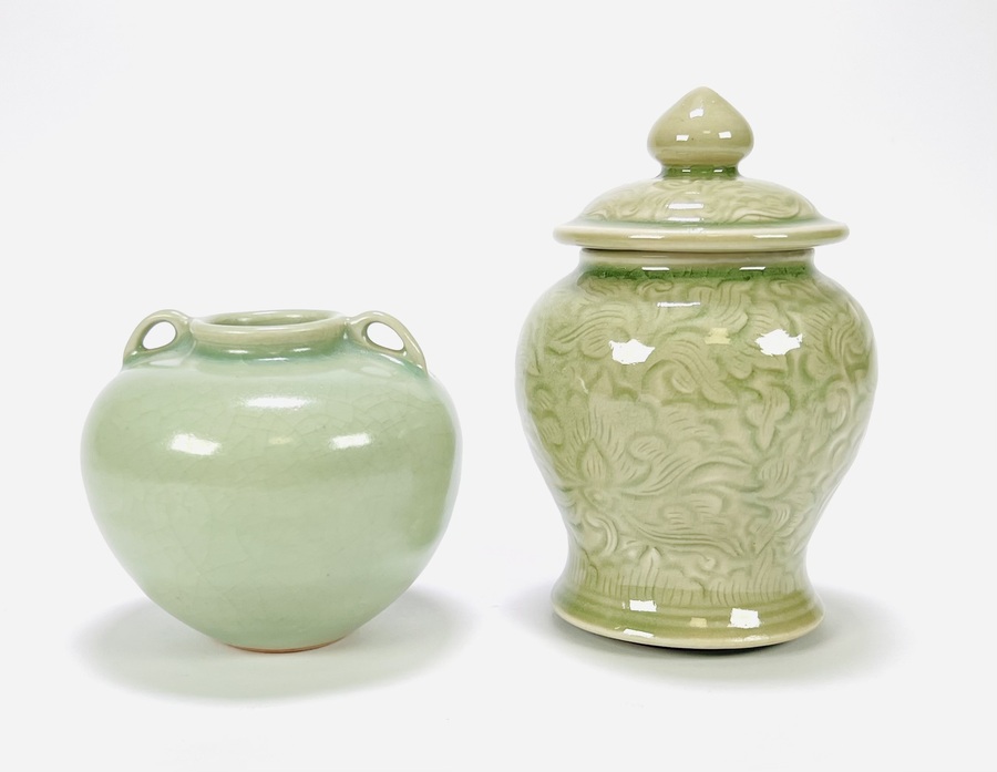 Keramieken vaasje en dekselvaasje: vaasje met transparant celadonglazuur in lichtgroene tint en lokaal craquelé, hooggestookt en geglazuurd. Het vaasje heeft twee oorvormige handvatten en een ongeglazuurde roodbruine voetring. De dekselvaas toont een plastische florale band en een bijpassend knopdeksel. Herkomst Azië, circa 1970-2000.