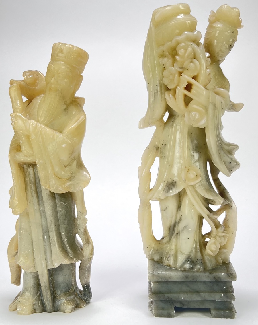 Twee Chinese beelden, circa 1950–1970. Uitgevoerd in speksteen, handgesneden en gepolijst. Voorstelling van een man met langbaard en ruyi-scepter en een vrouw met bloemen, één geplaatst op gelaagde sokkel van dezelfde steen. Halfopen gewerkte details en geaderd, lichtgroen tot oker kleurverloop.