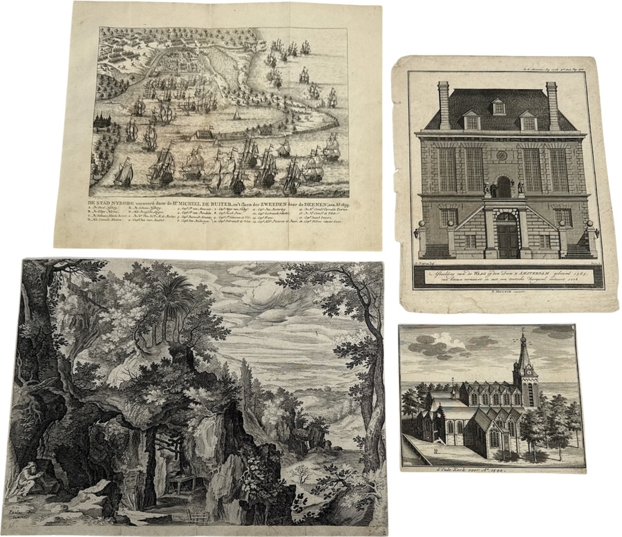 Vier kopergravures, omstreeks 17e–18e eeuw, op papier. Voorstellingen omvatten maritieme scène van Nyborg verovering door De Ruyter, aanzicht Amsterdams stadshuis met jaartallen 1665 en 1734, landschapsweergave met rotsen en bomen, en kerkexterieur met toren. Representatieve voorbeelden van Europese topografische, architectonische en landschappelijke prentkunst uit de vroegmoderne periode.